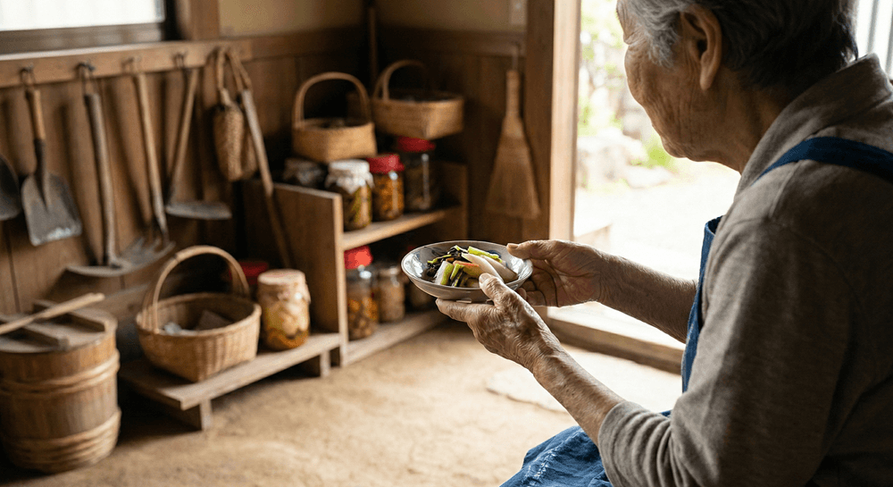 ポリッとかじると、塩気と一緒に、野菜の命そのものの味がしました。スーパーで買ったパック詰めのものではなく、おばあちゃんが自分の手で育て、漬け込んだ「保存食」。