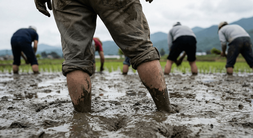 生暖かい田んぼの土と、遠くの笑い声